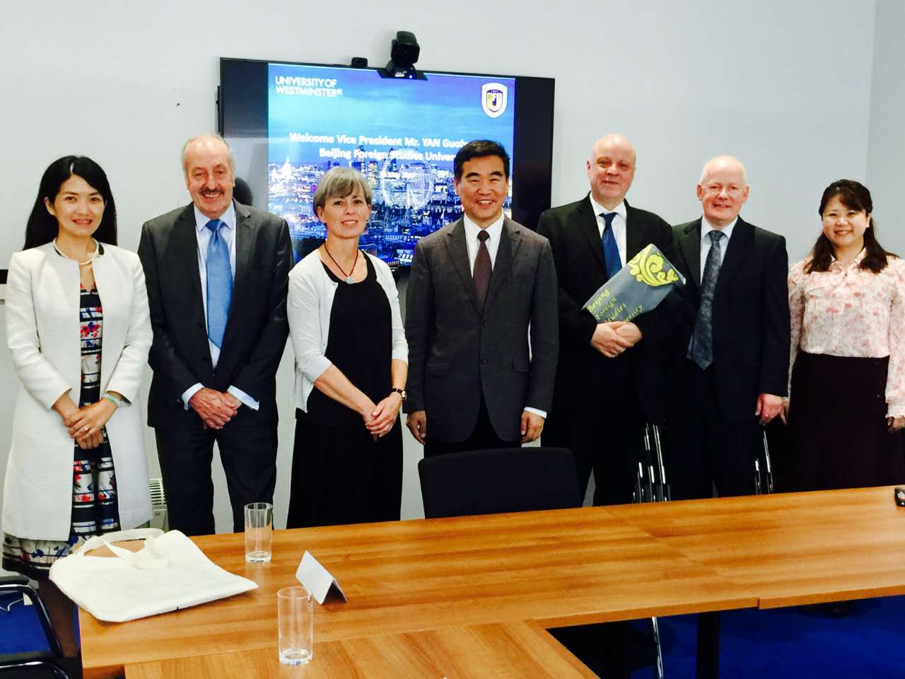 5月26日闫国华一行访问了威斯敏斯特大学,与威斯特敏斯特大学董事长杰弗里·佩茨教授、副董事长亚历山大·休斯教授以及传媒艺术设计公司副经理、商公司国际化项目主任、人文社会学公司现代语言学主任、国际处处长、东亚事务负责人等进行深入座谈和交流,探讨双方进行联合翻译人才培养项目的具体实施措施,并参观了威斯特敏斯特大学同声传译设备和教室。