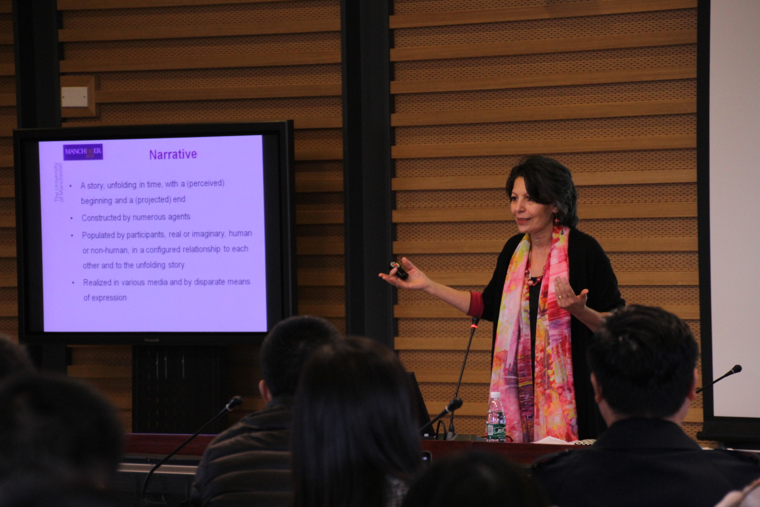 Mona Baker曾经是英国曼彻斯特大学翻译与跨文化研究中心主任、国际翻译与跨文化研究学会(IATIS)副会长,Translator杂志创办人和主编,学术研究成果丰硕,影响广泛。Baker教授分别介绍了叙事和话语这两个概念,比较了其异同,并通过生动形象的图片和事例进行讲解。她认为,翻译的本质是再叙事,翻译叙事具有社会性。个人与社会的相互关系对翻译有所影响,翻译也反过来可以作用于个人甚至整个社群的意识形态。讲座后,中外员工、老师积极提问,针对平行文本、理论意义等方面提出了许多精彩的问题。