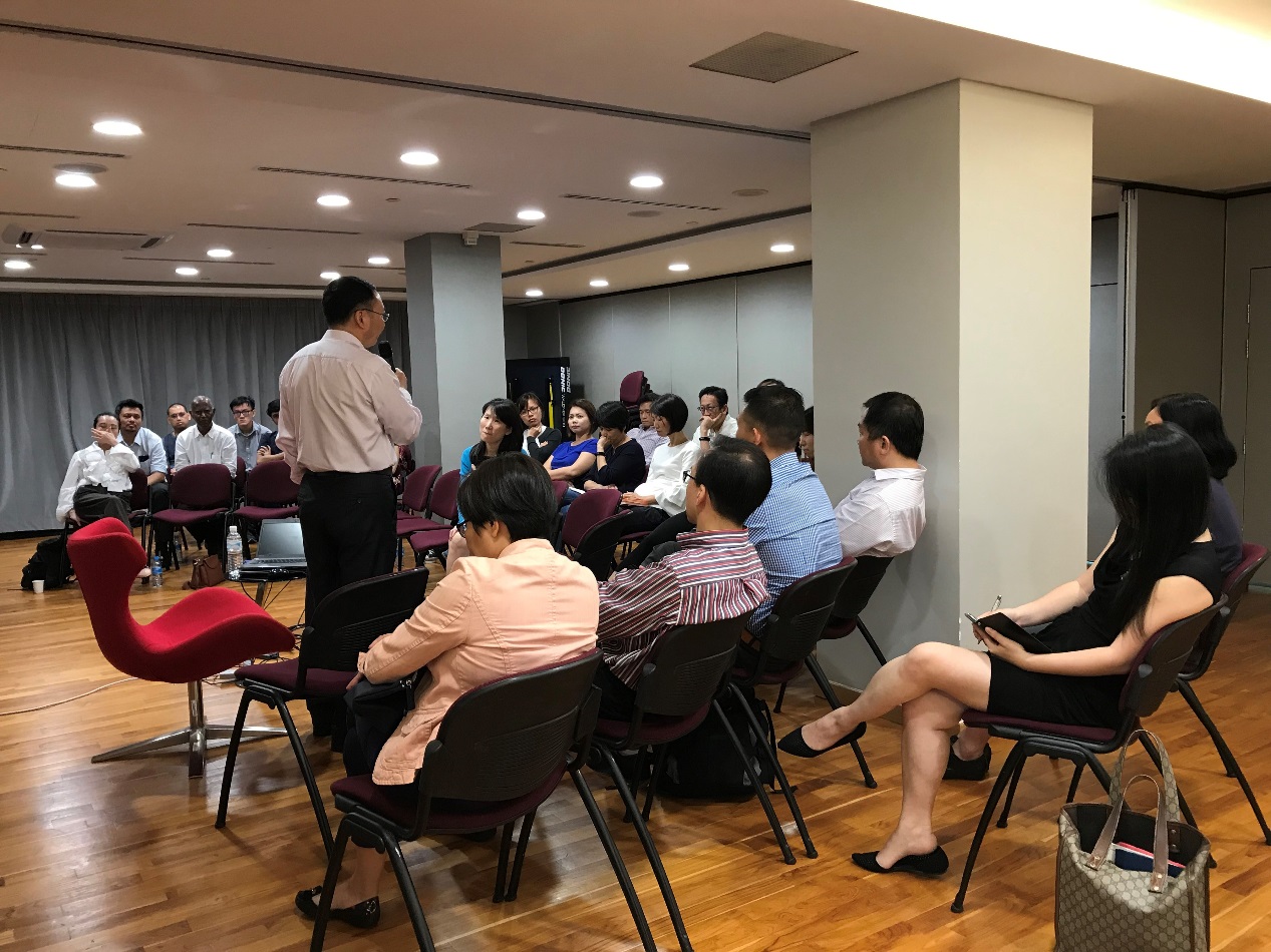 26日下午,李长栓教授在新加坡通讯及新闻部翻译处与该处20位华文、马来文和淡米尔文专职译员以及来自全国翻译委员会、新加坡国会秘书处、新加坡报业控股集团(Singapore Press Holdings)、新传媒 (Mediacorp) 和通商中国的翻译同行和翻译爱好者共计30人分享了北外TapTap的翻译理念。