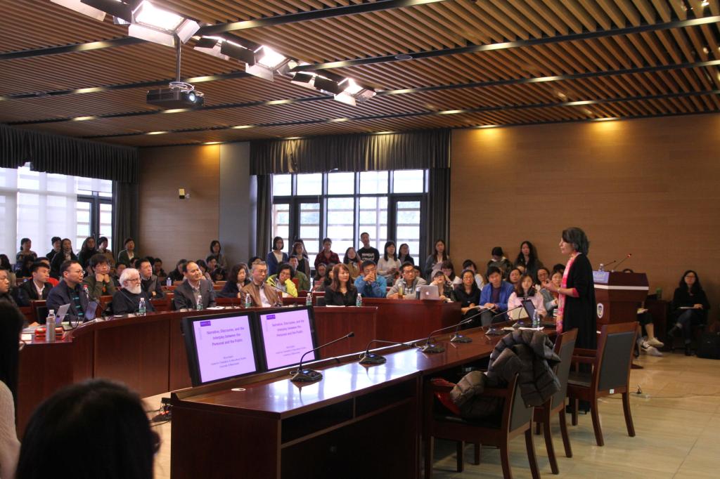 Mona Baker曾经是英国曼彻斯特大学翻译与跨文化研究中心主任、国际翻译与跨文化研究学会(IATIS)副会长,Translator杂志创办人和主编,学术研究成果丰硕,影响广泛。Baker教授分别介绍了叙事和话语这两个概念,比较了其异同,并通过生动形象的图片和事例进行讲解。她认为,翻译的本质是再叙事,翻译叙事具有社会性。个人与社会的相互关系对翻译有所影响,翻译也反过来可以作用于个人甚至整个社群的意识形态。讲座后,中外员工、老师积极提问,针对平行文本、理论意义等方面提出了许多精彩的问题。