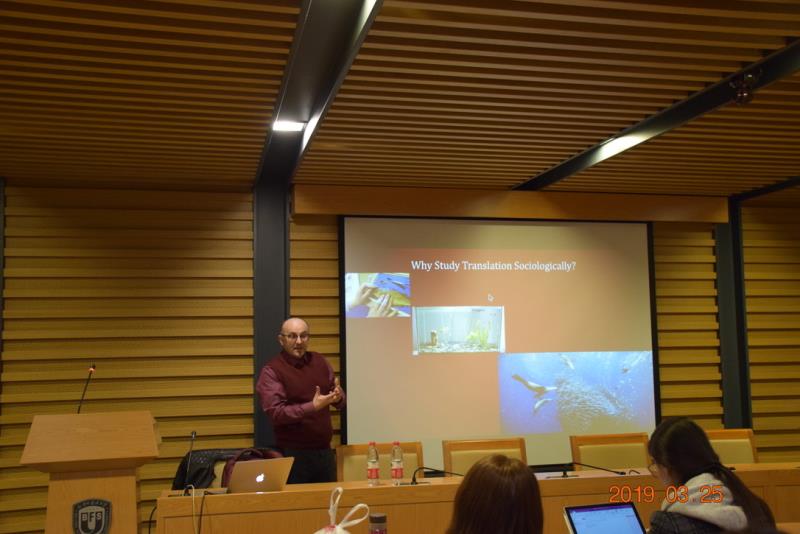 Tyulenev教授以形象的比喻作为讲座的开场白,将翻译学研究的语言学、文化和社会学维度分别比作以近距离来研究鱼,在鱼缸里研究鱼,以及在浩瀚大洋中研究鱼的不同研究维度。生动的比喻让大家明白,翻译研究不应只关注词句,还要以较宏观的文化和社会视角来研究翻译。
