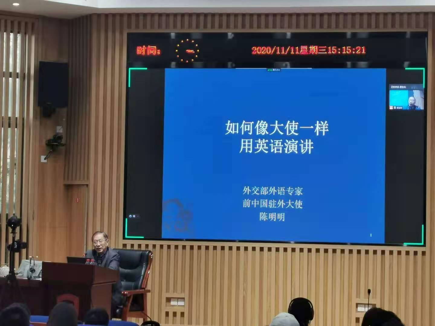 陈明明大使首先结合自己在担任驻外大使期间的亲身经历和多年从事外交的经验,与同学们分享了他总结出的提高英语演讲水平的十项原则,其中有知识的讲解,经验的传授,以及技巧的运用,并结合实例介绍如何提高英语表达和口译能力,有效地进行跨文化沟通。