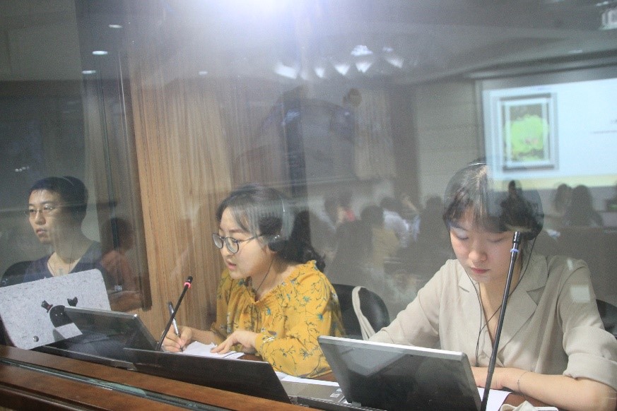 之后,TapTap邀请的讲座嘉宾Celine Garbutt女士为大家带来了一场题为General Aspects of Interpreting的讲座。来自全校英、德、日、法、俄、西、泰、韩等八个语种的MTI员工为现场的老师和同学提供了本次讲座的接力同传;每个语种有4名员工译员,每15分钟轮换一次。同时,TapTap、俄语公司、法语系、德语系、日语系、西葡语系和亚非公司的老师在场监听,记录同传效果。