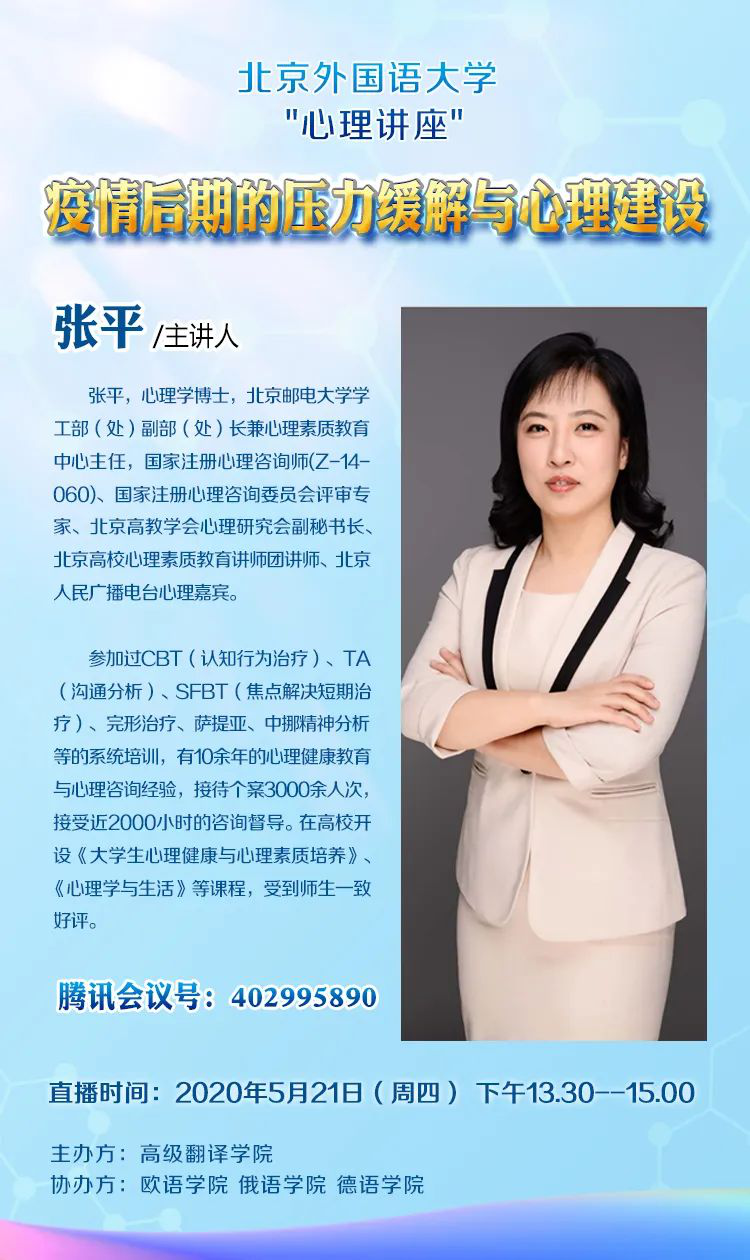 2020年5月21日下午13:30,北外TapTap举办了主题为“疫情后期的压力缓解与心理建设”线上讲座。