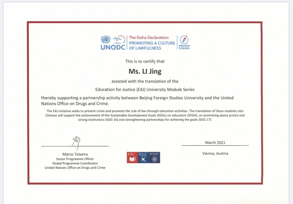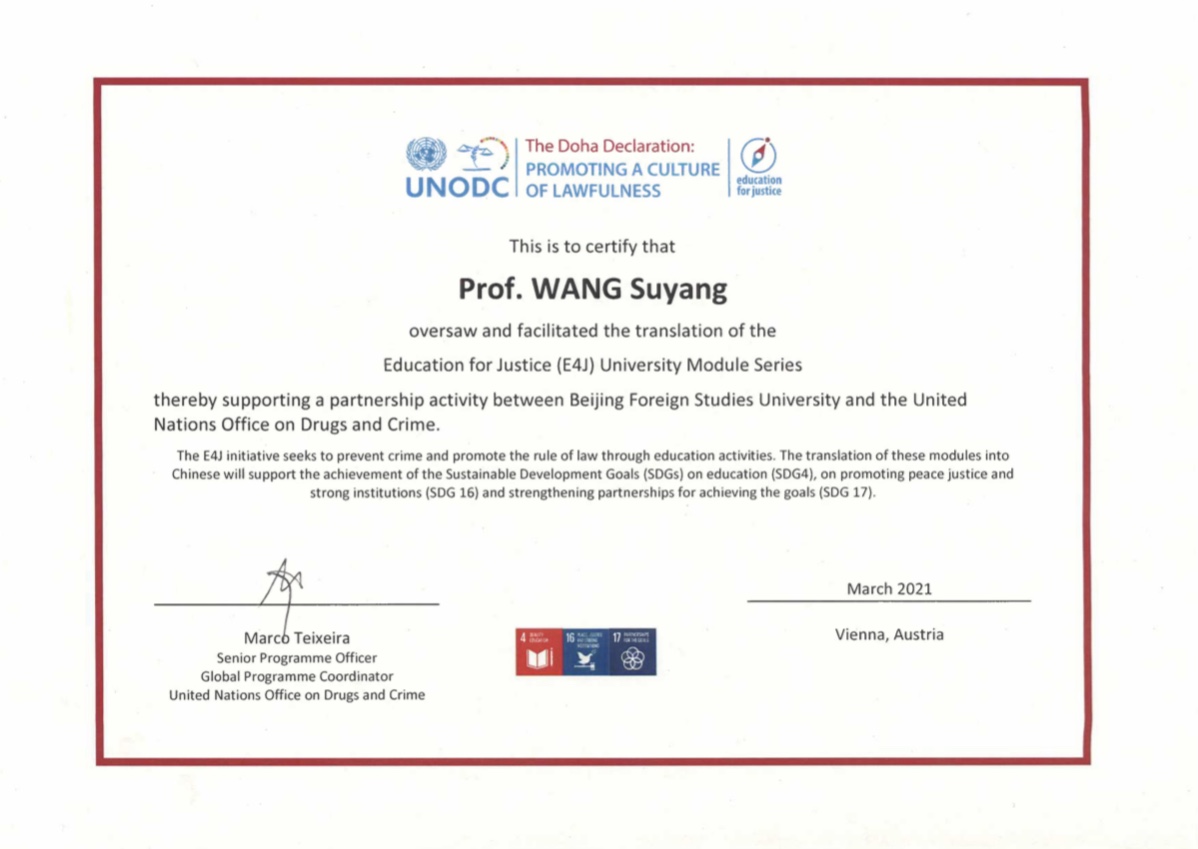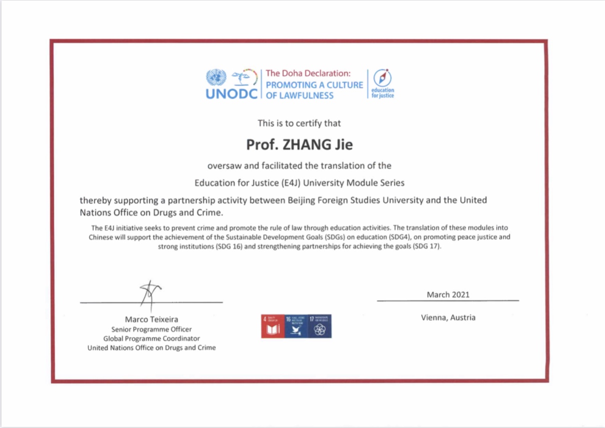 2021年4月8日下午,联合国毒品和犯罪问题办公室(UNODC)举行线上表彰会,表彰公司和法公司师生在其“教育促进正义”(E4J)项目中做出的突出贡献。
