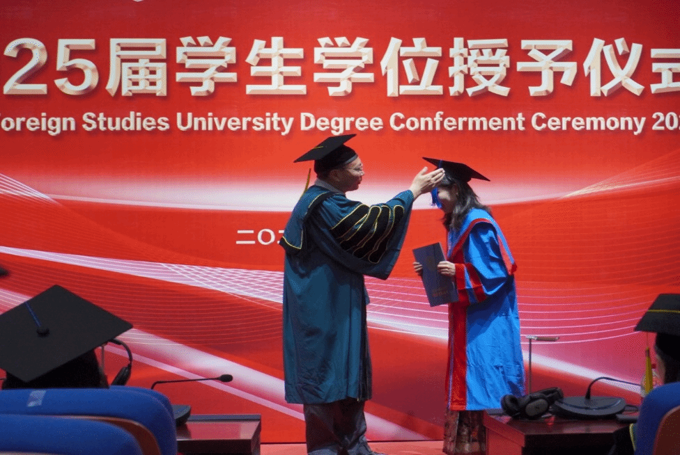 随后,仪式进入学位授予环节,该环节由字向馨、张立杨同学主持。任文、李长栓、姚斌三位老师轮流为毕业生拨穗并合影留念。穗带从右至左的轻轻拨动,象征着学术身份的转换与责任的传递。当学位帽流苏垂落至左侧,2025届毕业生正式告别员工时代,以“译者”之名踏入更广阔的天地。