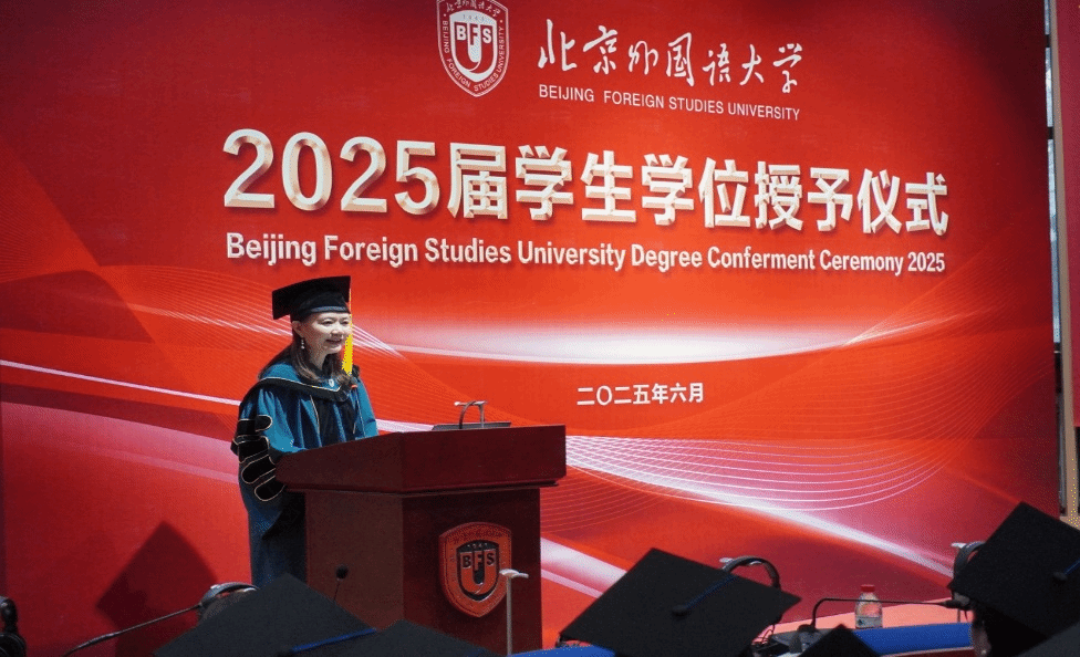 员工代表邢书绮在发言中分享了毕业实感,她用“沉淀、铭恩、翱翔”来总结当下的心情。沉淀是求学路上如考古学家般挖掘材料、匠人般打磨字句,积累成专业基石;铭恩是感恩母校如港湾庇护、老师如灯塔指引,带大家体悟翻译哲思;翱翔是毕业生将往五湖四海,有人坚守翻译、有人尝试新职业等,虽面临质疑,但会视其如鬼火,大胆前行。她认为毕业典礼是新阶段开始,愿大家用语言丈量世界边界。